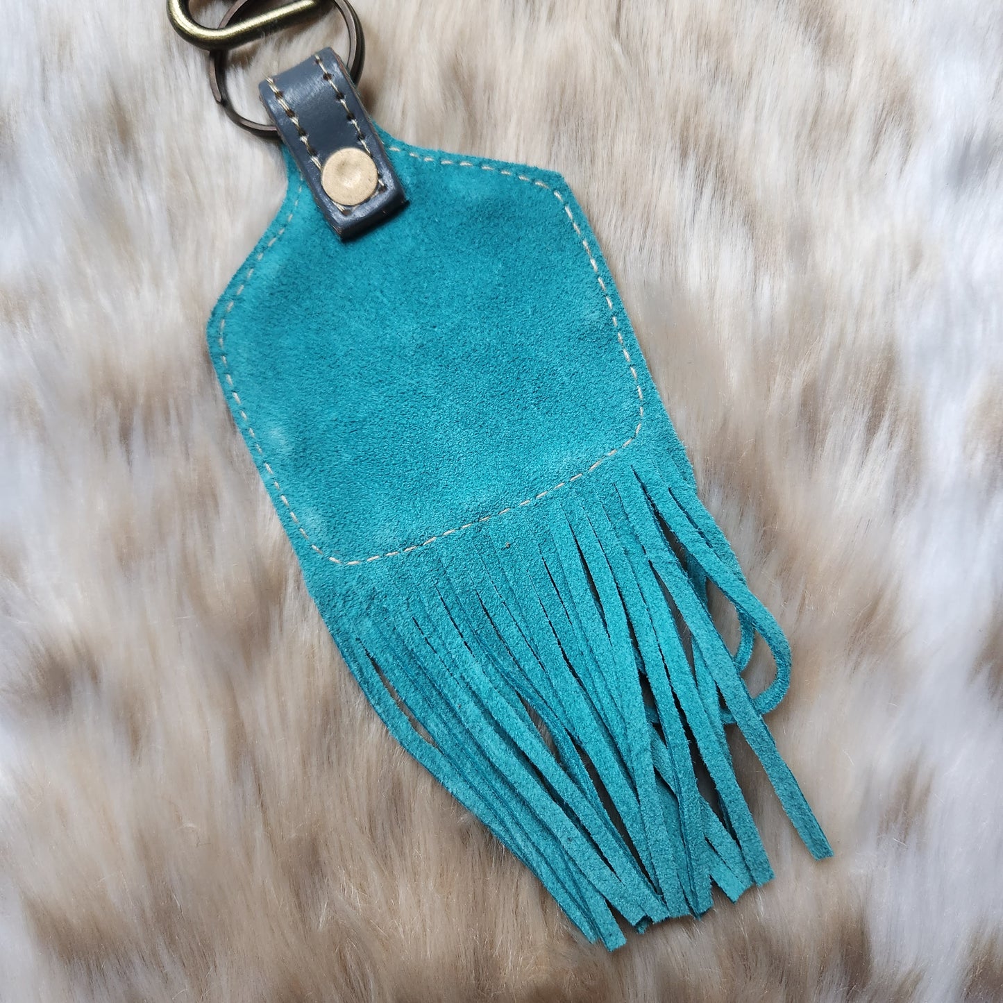 Saddle up your style with our Western-inspired leather Yeehaw Keychain featuring chic teal fringe details. Crafted with genuine leather, this key accessory effortlessly combines rugged charm with a pop of color. The teal fringe adds a touch of flair reminiscent of the open frontier, making it a statement piece for your keys or bag. Upgrade your everyday essentials with this unique Western-inspired keychain, blending timeless leather craftsmanship with a contemporary twist.