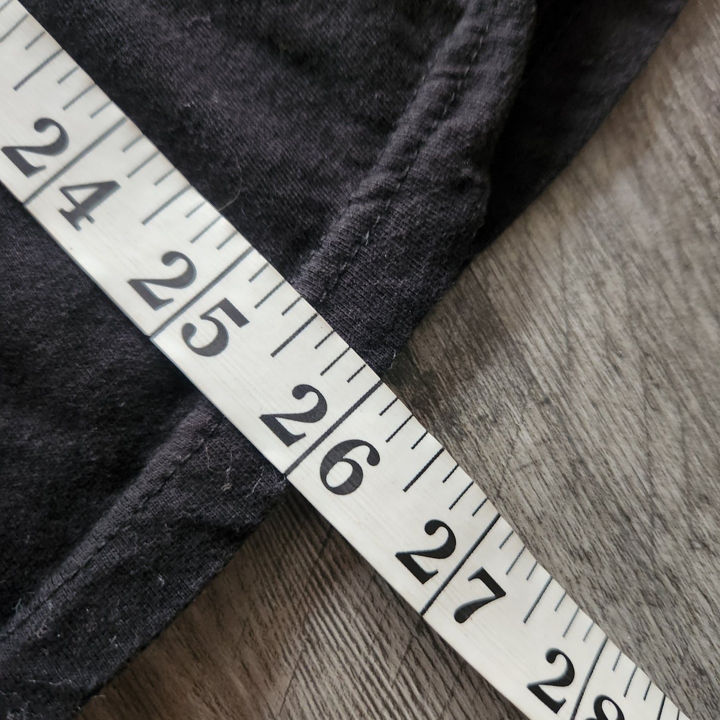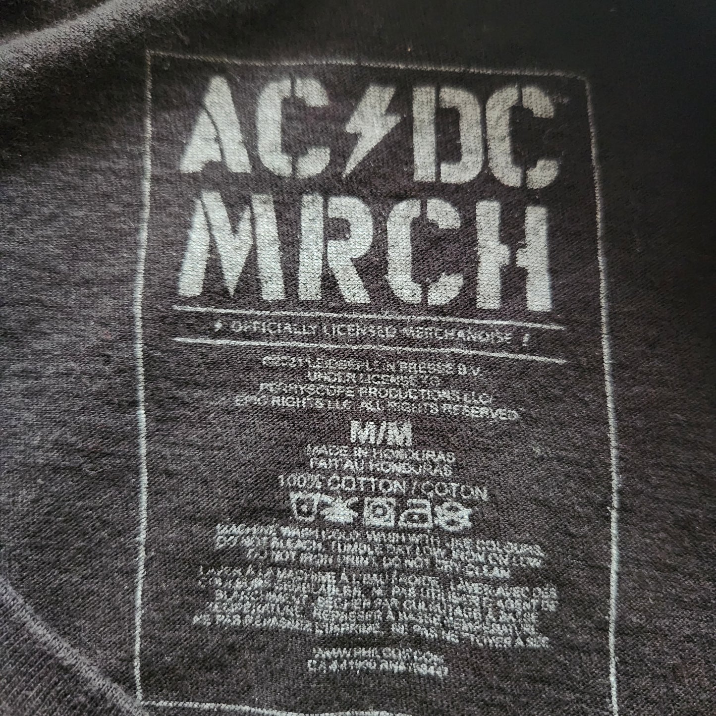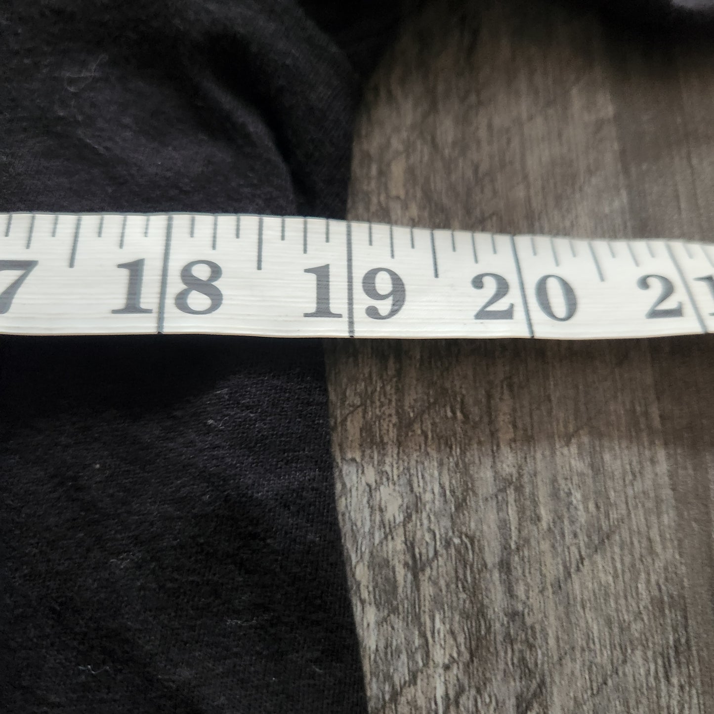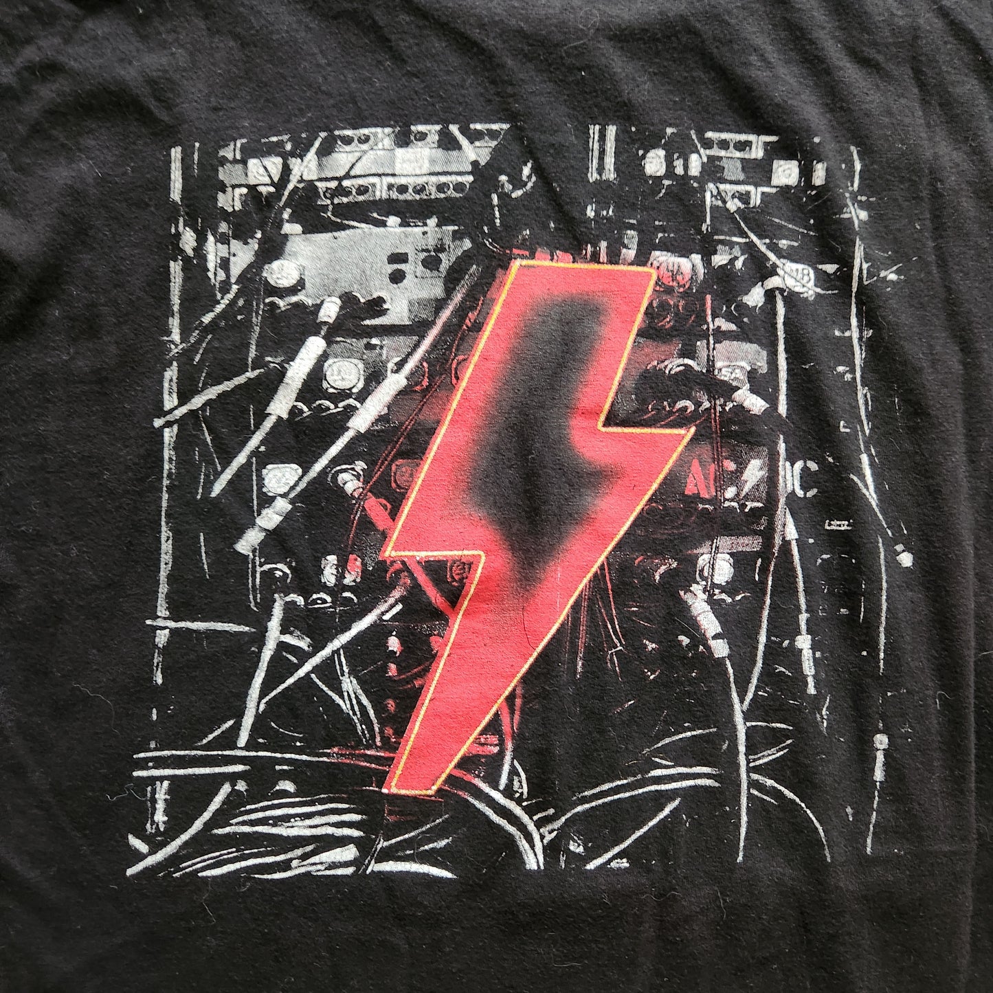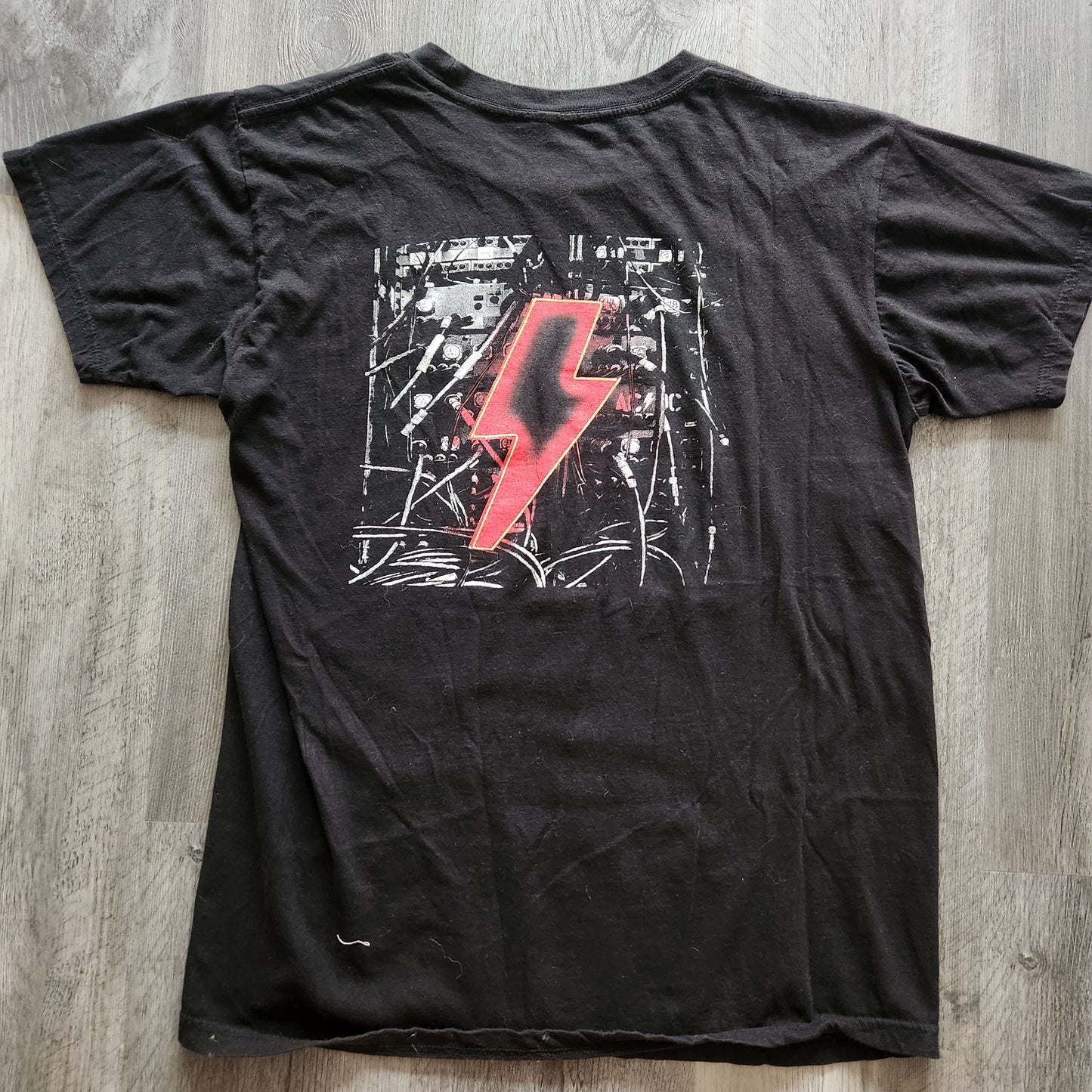 Short sleeve crewneck black tee with red and white graphic of band on front and band logo and sound board on back