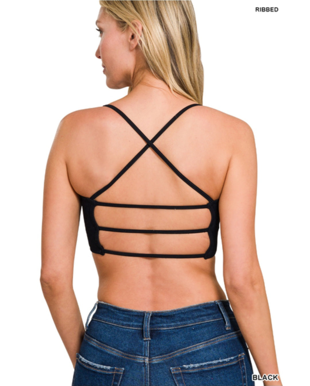 Turn heads with this chic black ribbed bralette, featuring an open back design with three sleek straps for a bold, modern look. Comfortable and versatile, it's the perfect layering piece or standout top for any fashion-forward wardrobe.