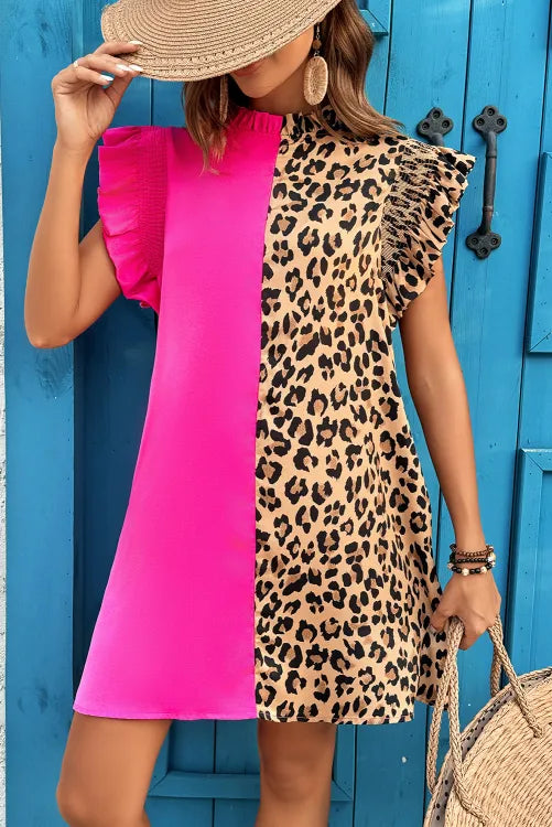 Regular price $25.00Turn heads in this bold high neck mini dress, featuring playful ruffle sleeves and a striking half hot pink, half leopard print design. Perfect for statement-making style, this eye-catching dress blends fierce and feminine in one unforgettable look.