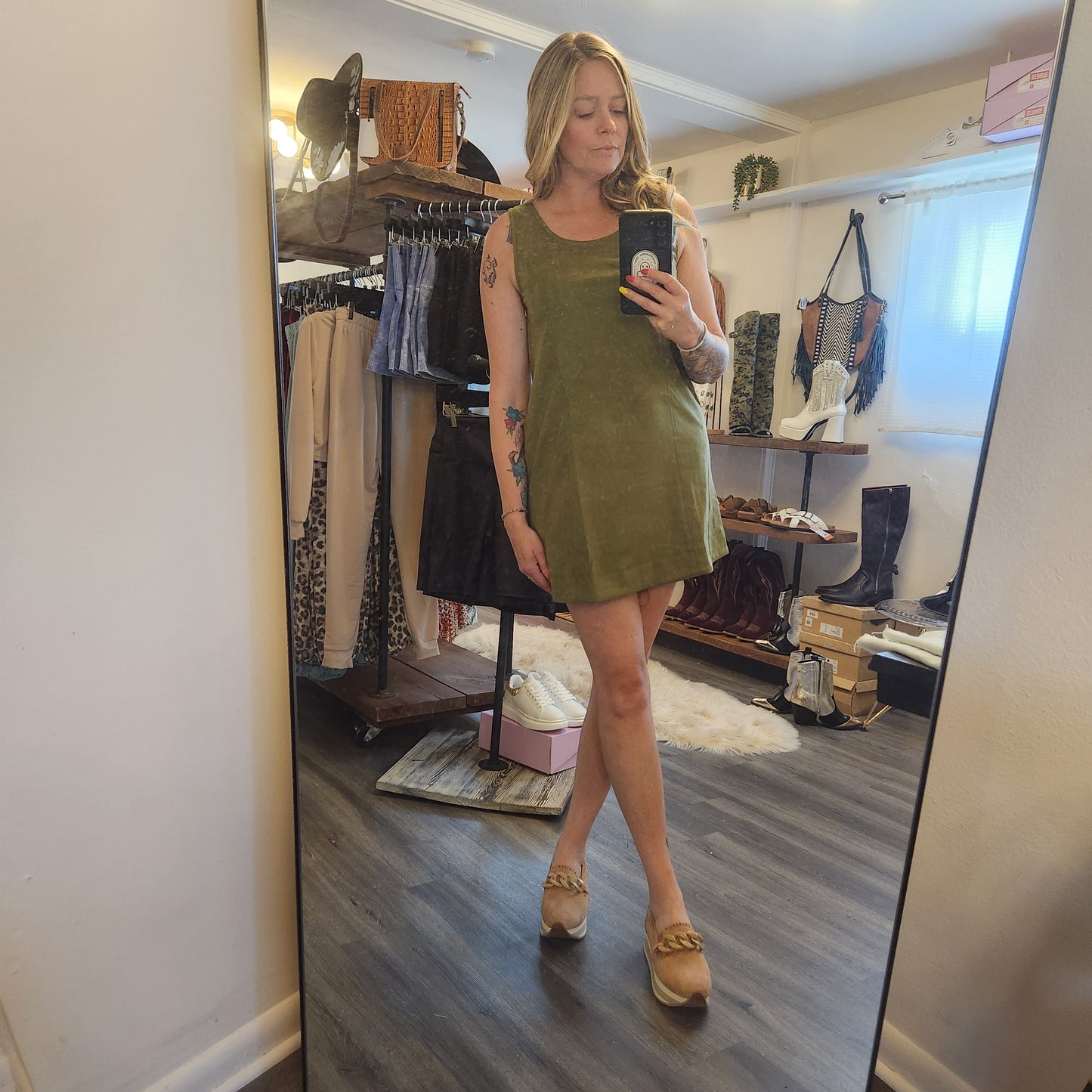 This olive green faux suede mini dress features overall-style straps with snap closures for adjustable length and a perfect fit. Soft and stylish, it’s a versatile piece that pairs effortlessly with tees, turtlenecks, or layered sweaters for year-round wear.