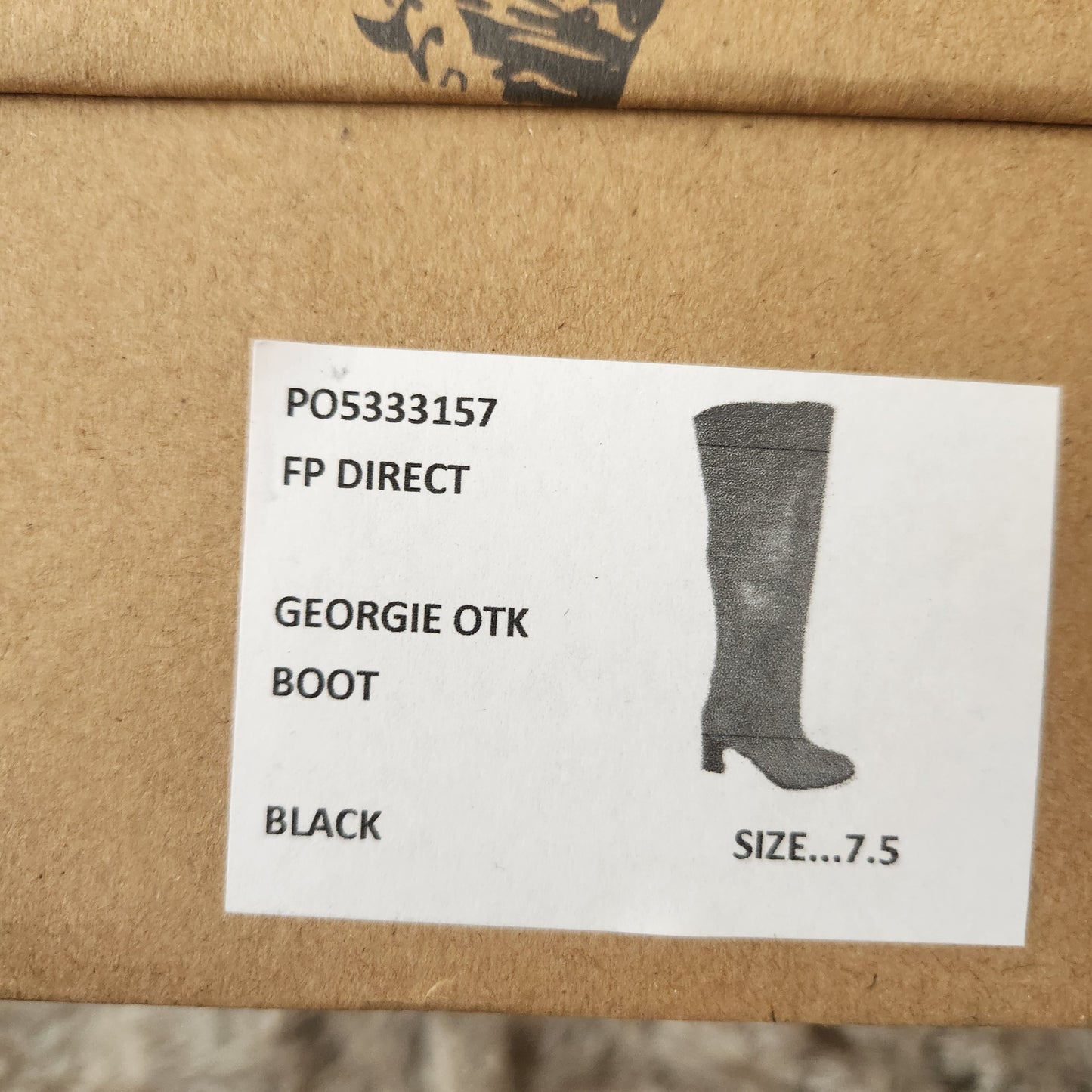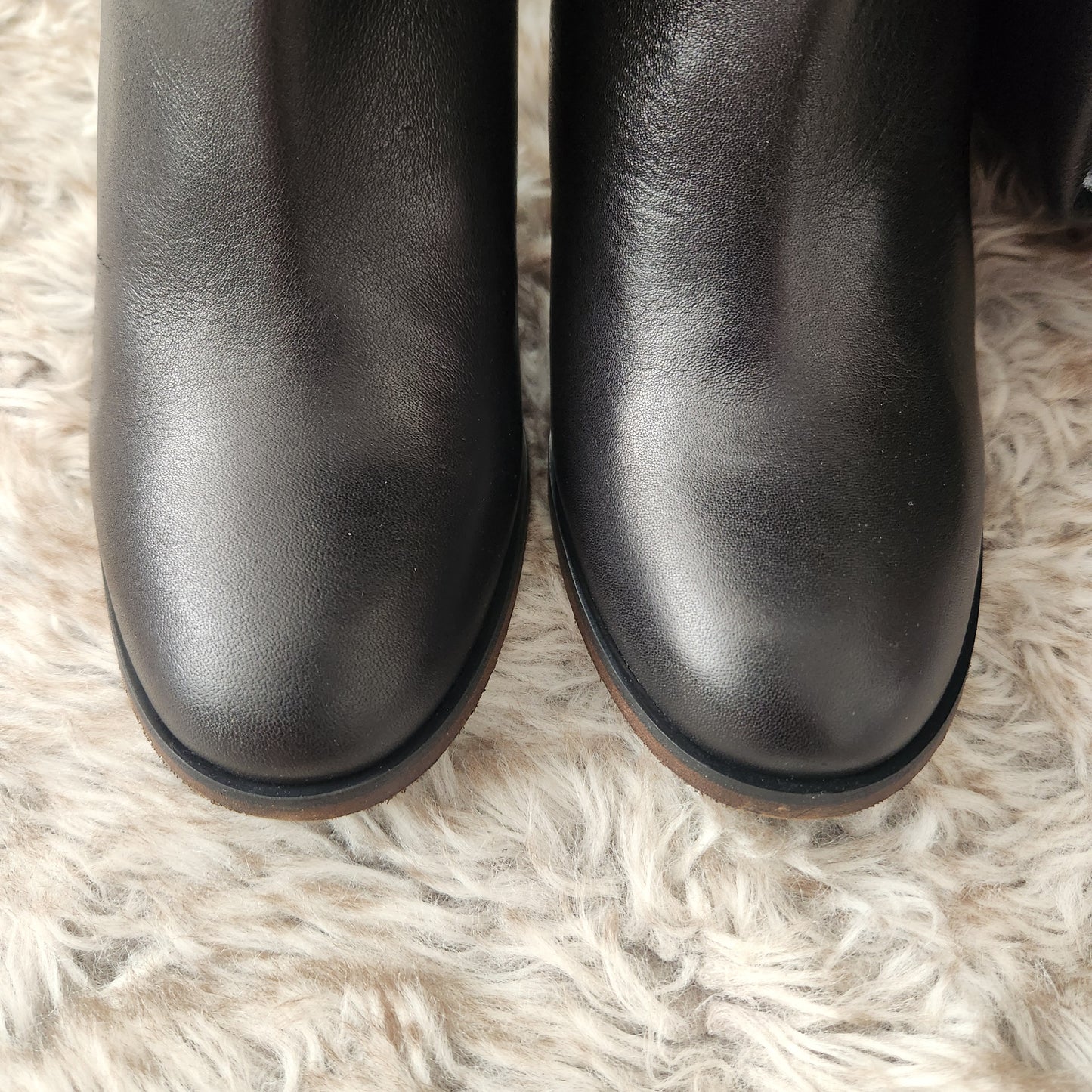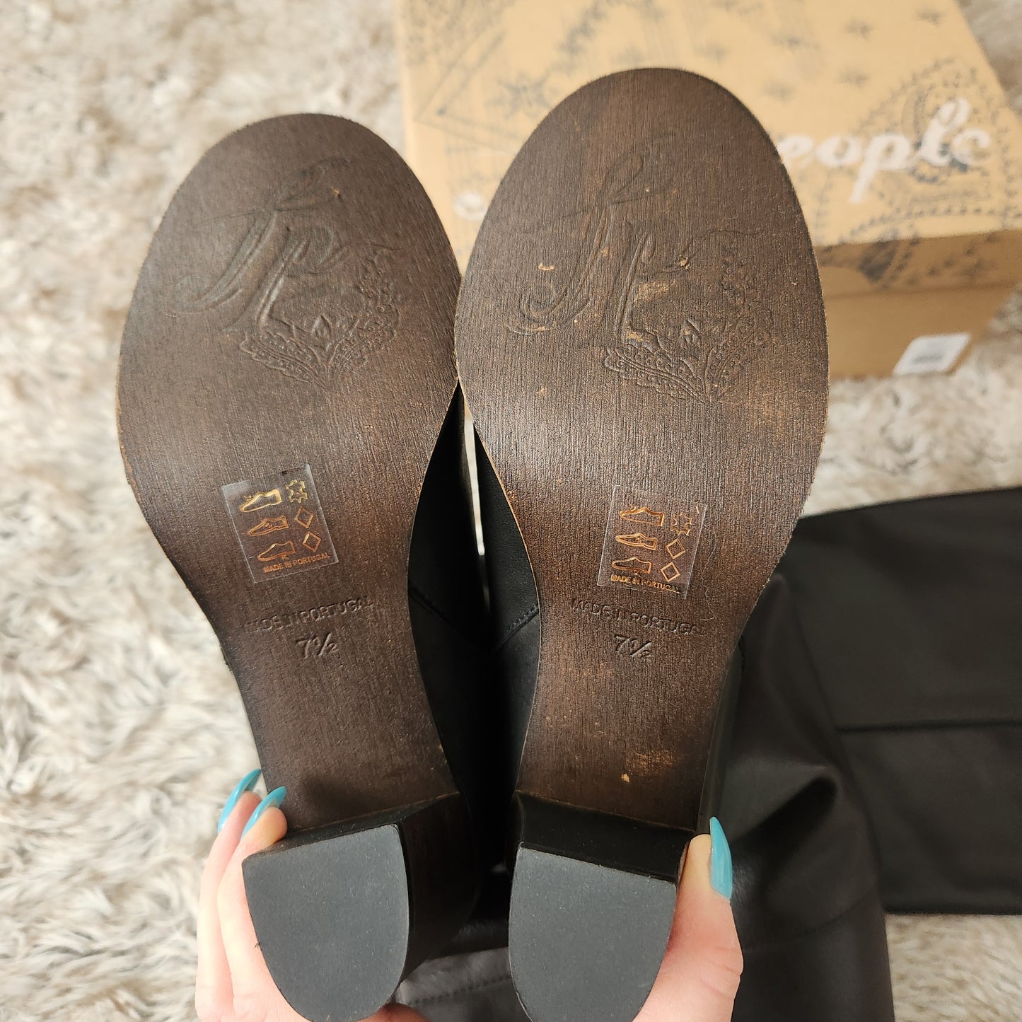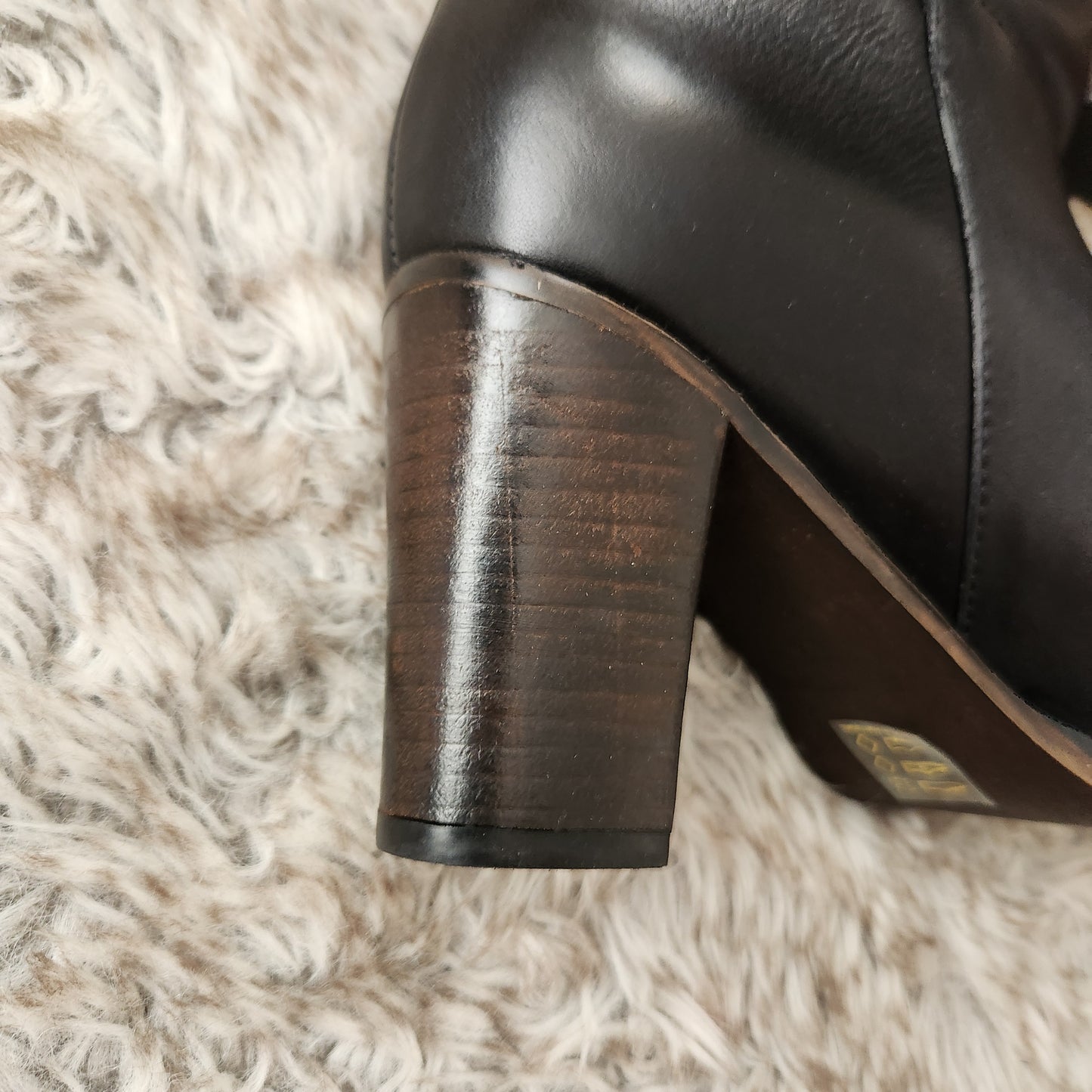 Round toe, stacked block heels, over the knee slouchy fit black leather boots