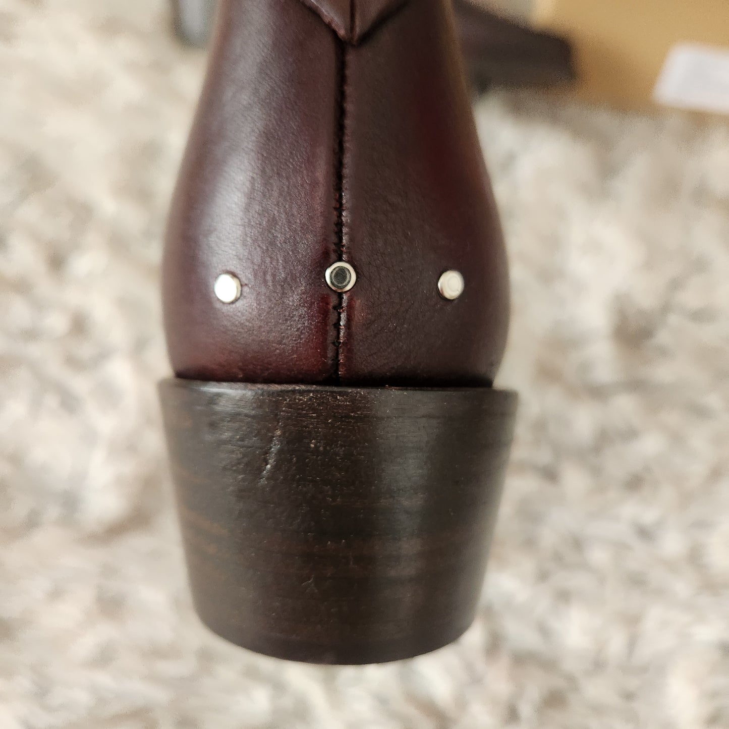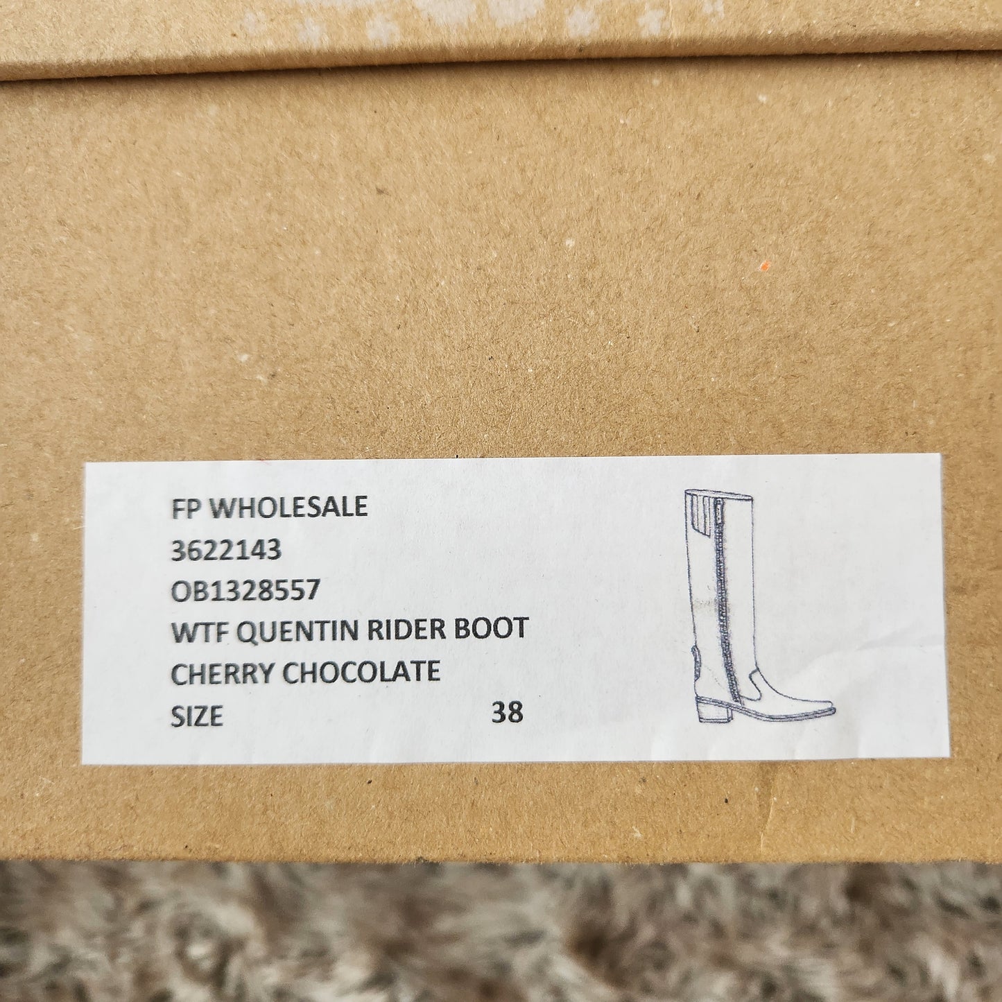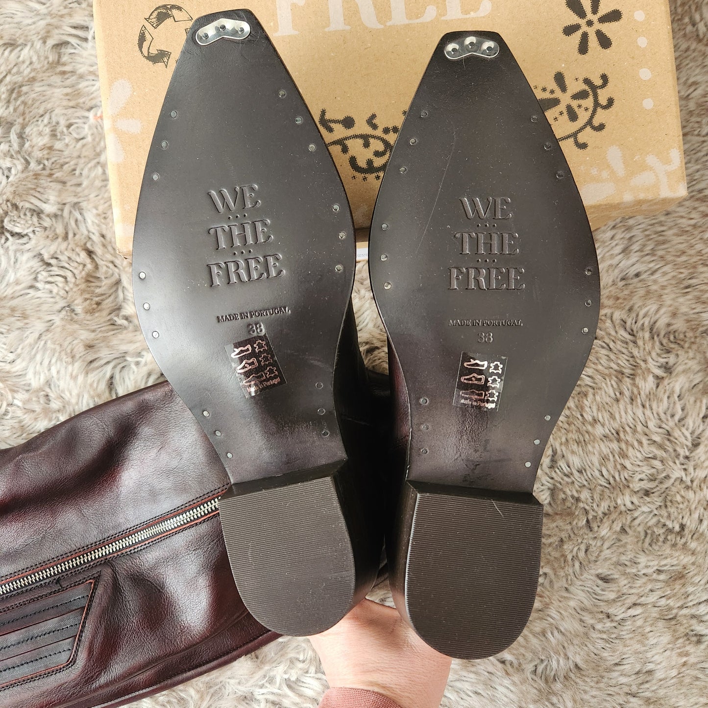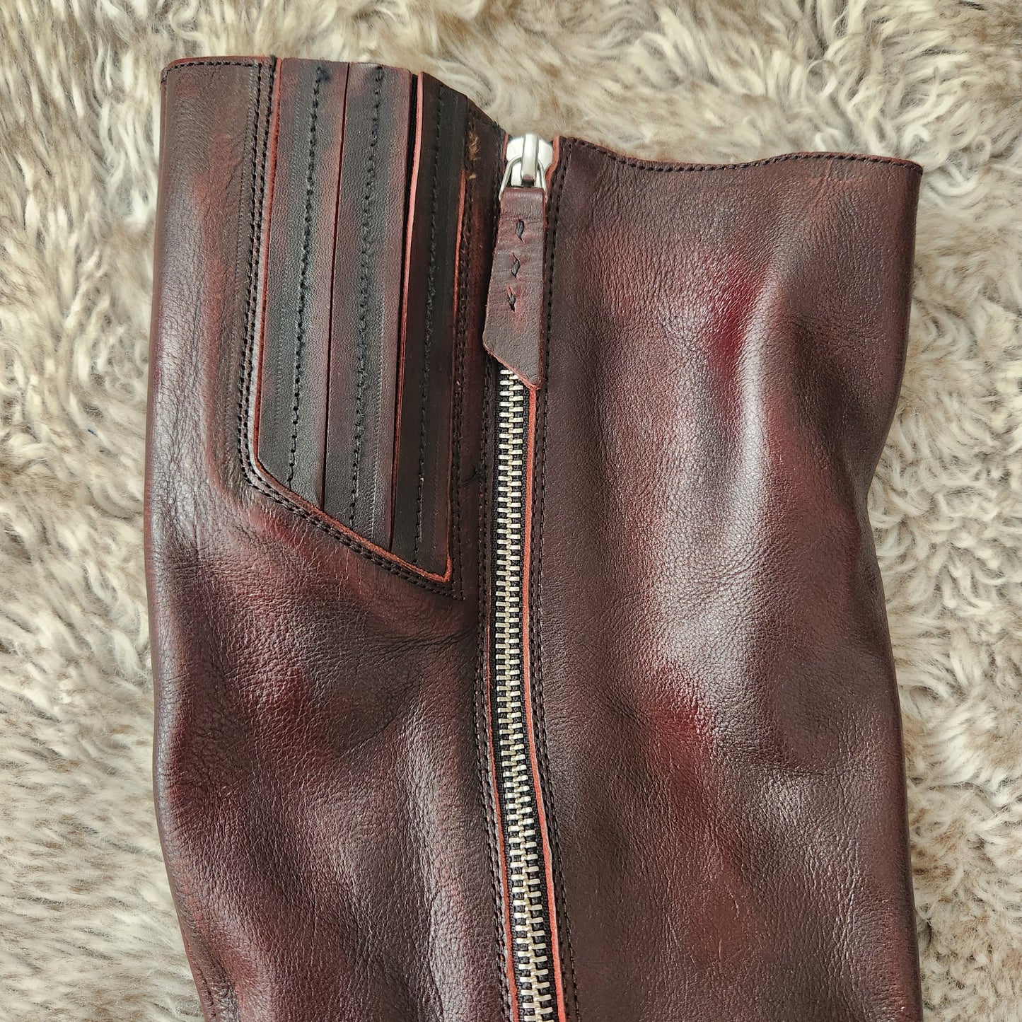 Cherry chocolate leather knee-high rider boots with a low heel, inside zip closure, and squared toes