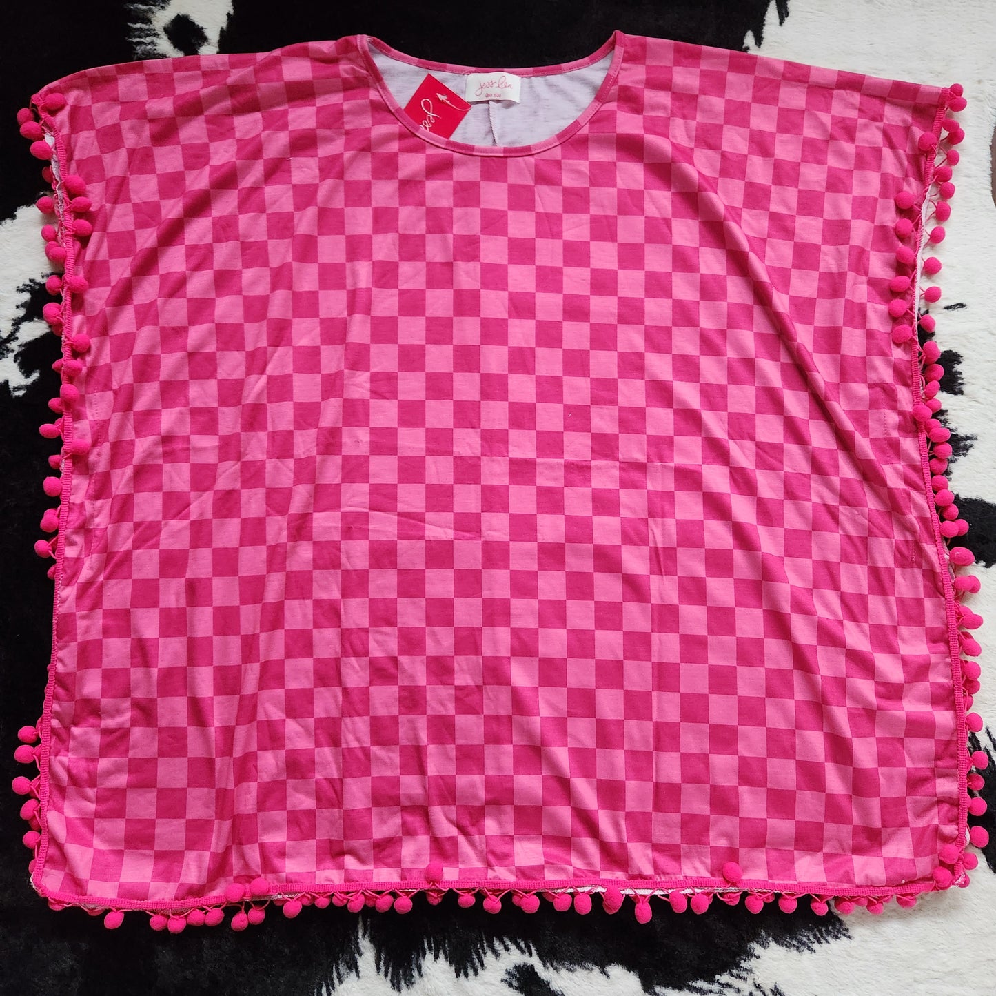 Regular price $30.00Dip into style with our western-inspired Camilla Cover-Up. This vibrant piece seamlessly fuses fashion and function, featuring a playful pink checker pattern that captures the essence of the Wild West. The whimsical pom trim adds a touch of flair, making it the perfect poolside or beach companion. Whether you're lounging by the water or strolling the boardwalk, make a statement with this on-trend cover-up that effortlessly combines Western charm and contemporary style