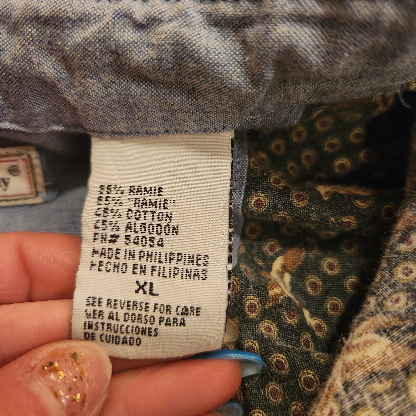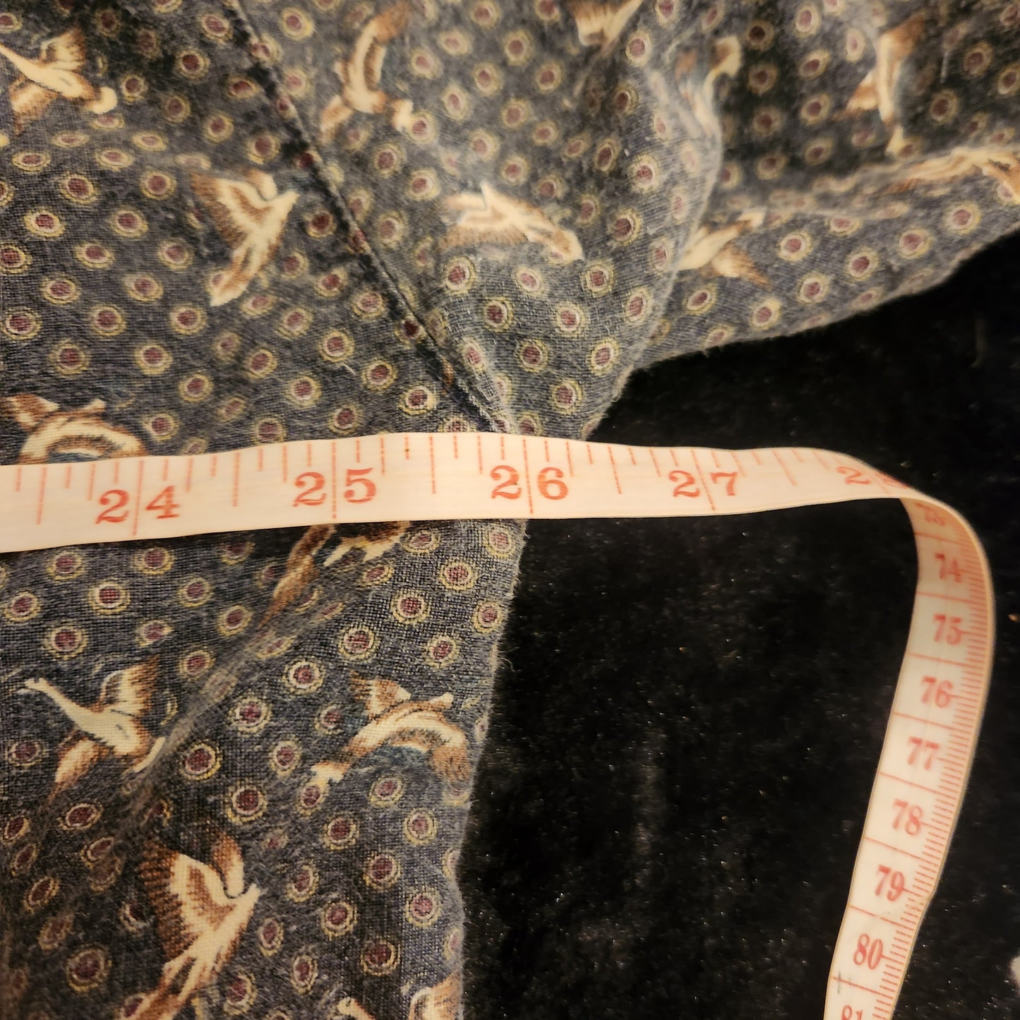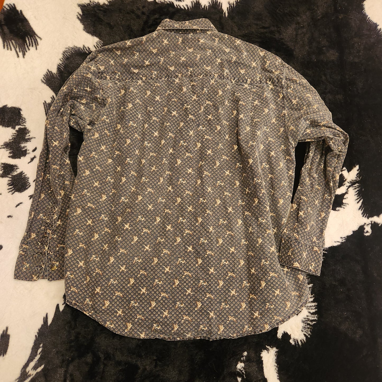 Blue background, long sleeve, button down vintage shirt with all-over duck print. Men's size XL