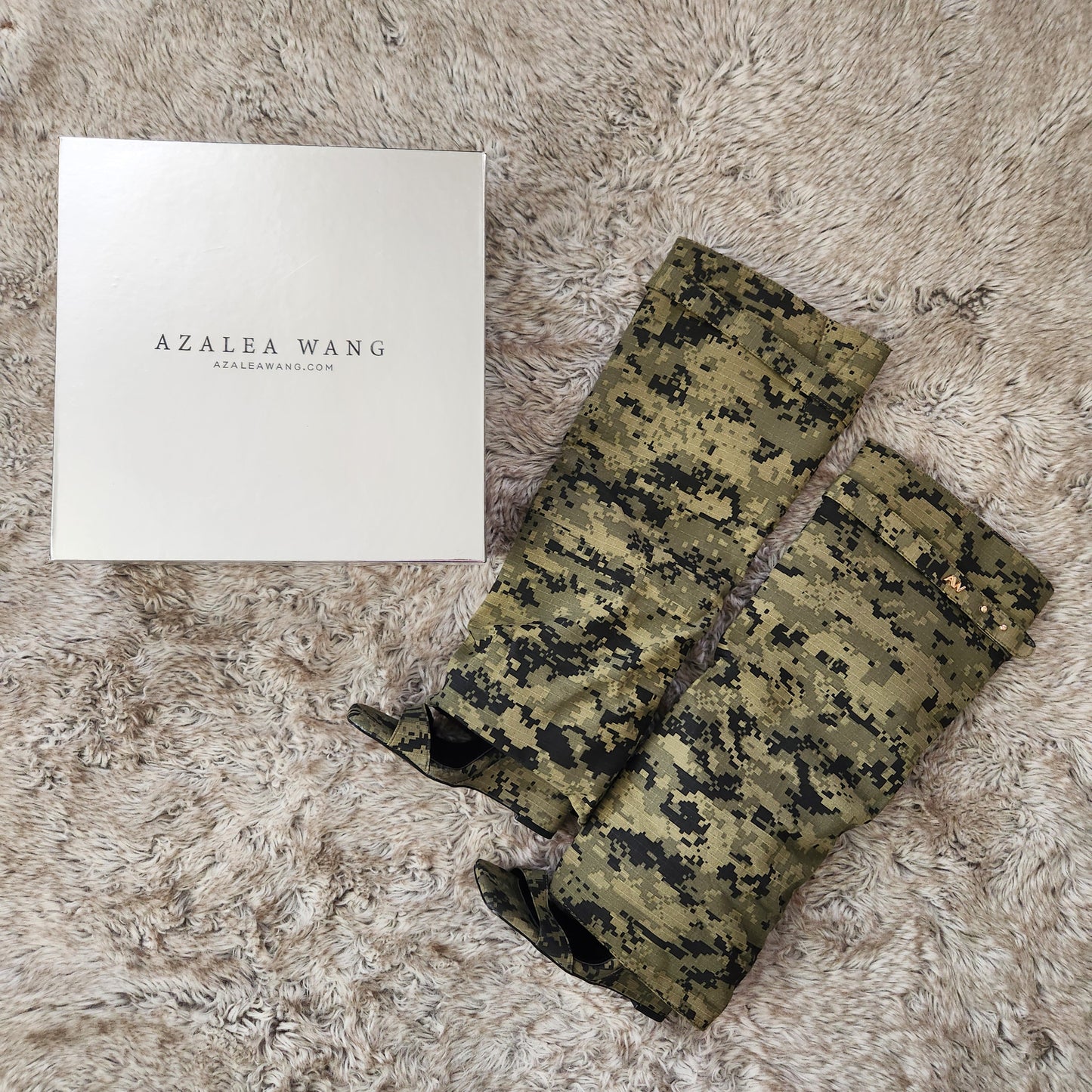 Step up your style with these bold knee-high camouflage sandal boots, featuring open toes and a sleek wedge heel for added height and comfort. Perfect for festival fashion or standout summer looks, these unique boots blend edgy military vibes with feminine flair.