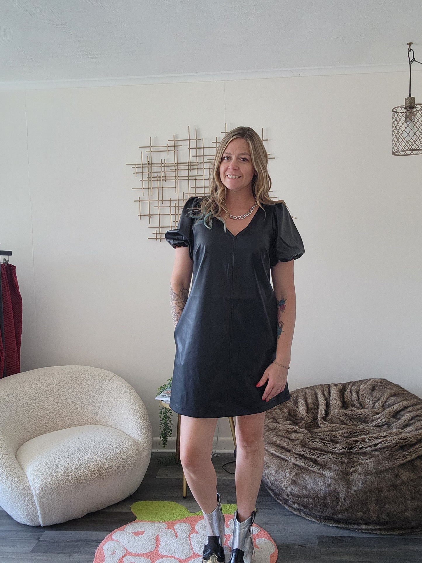 This black pleather Steve Madden dress features a flattering v-neckline, short puff sleeves, and convenient side pockets for a chic yet functional style. Perfect for a night out or an edgy daytime look, it combines modern elegance with a bold statement.