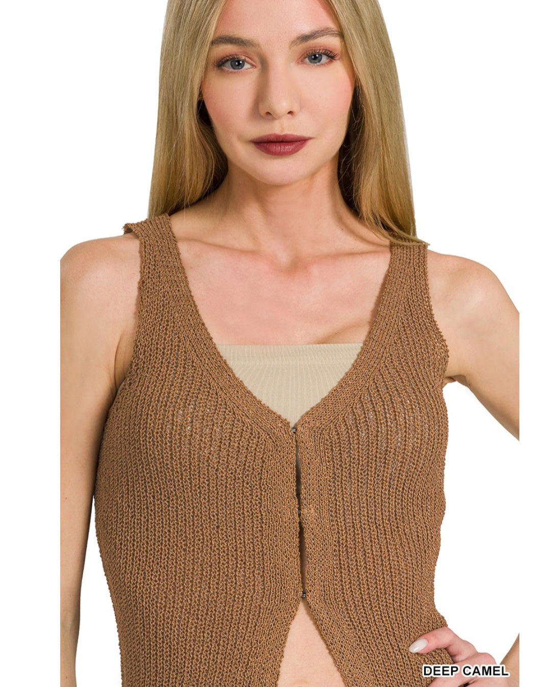 This light brown sleeveless knit vest features three hook-and-eye closures at the bust with a stylish open bottom for a flattering, boho-chic look. Soft and versatile, it’s perfect for layering over blouses, tees, or dresses for an effortless boutique-style outfit.