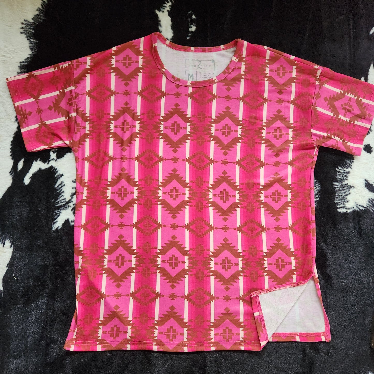 Step into the Wild West with our western, oversized Tennessee Tee featuring a vibrant pink Aztec print. Embrace a fusion of comfort and style with the loose fit and eye-catching design that effortlessly blends contemporary fashion with Southwestern flair. Crafted for both trendsetting and comfort, this 2Fly brand tee is perfect for casual days with a statement. The pink Aztec print adds a pop of color to your wardrobe, making it a must-have piece for those who appreciate bold fashion choices. Elevate your style game with this Western-inspired tee that seamlessly marries comfort and chic aesthetics.