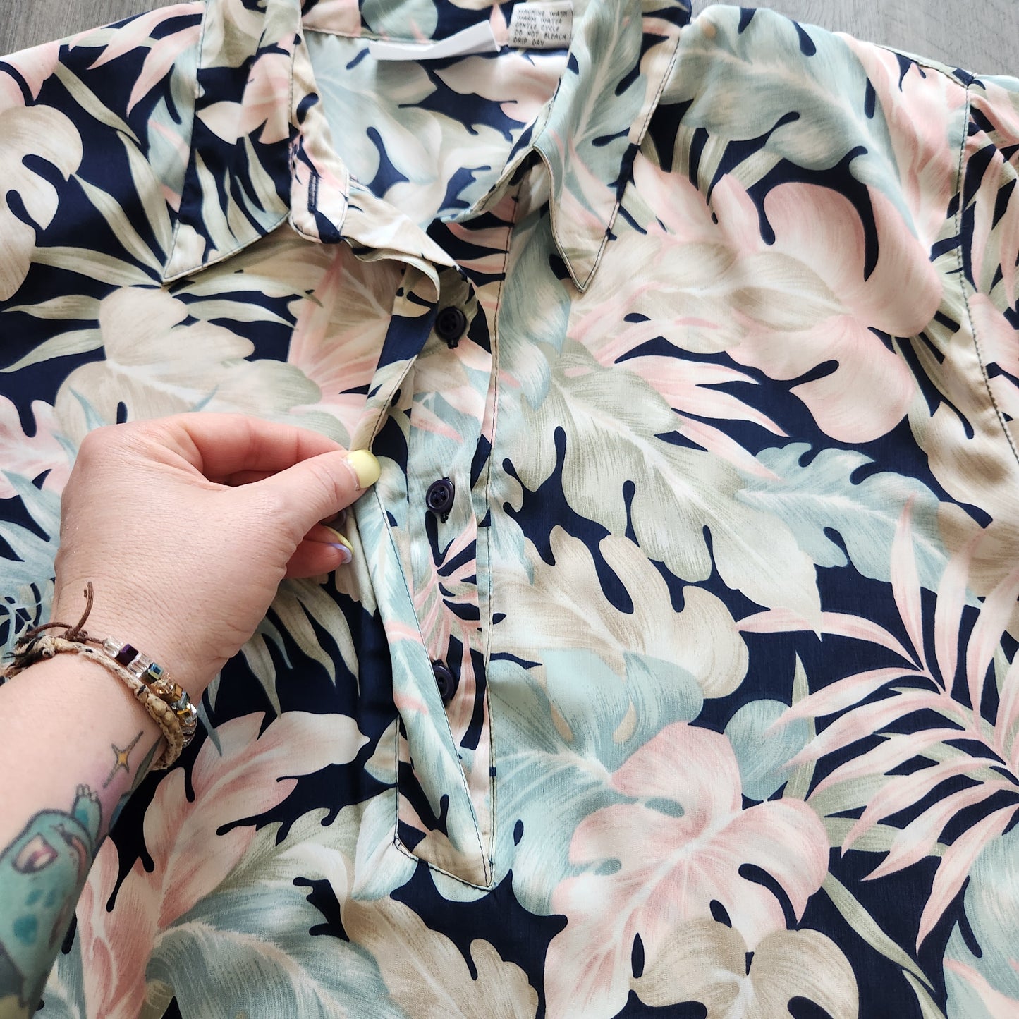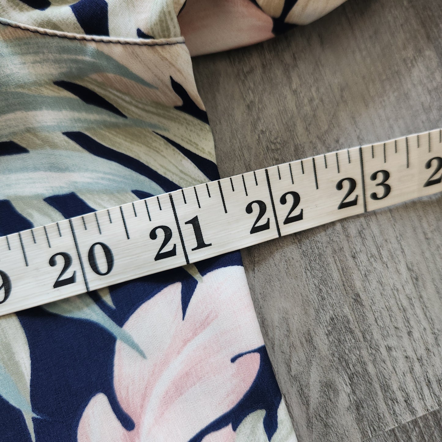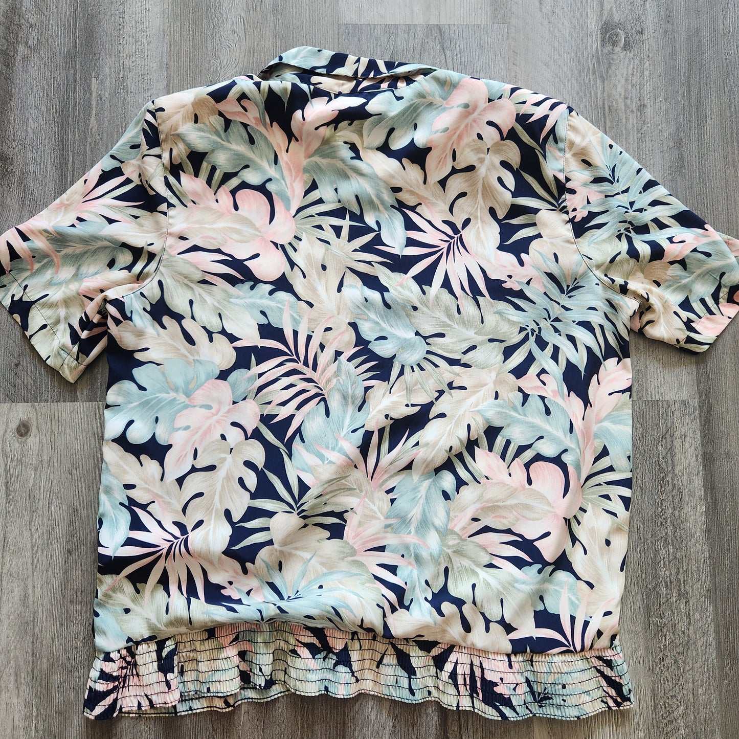 Short Sleeve, collared top with stretchy, smocked bottom hem and half button down front. Women's size 10