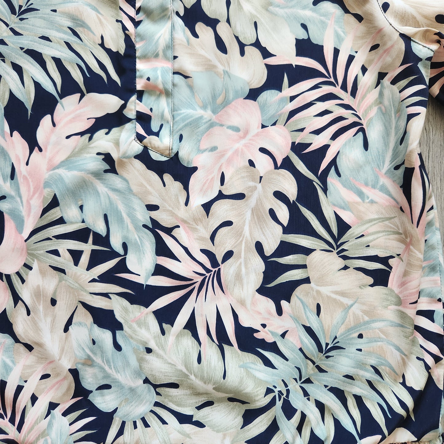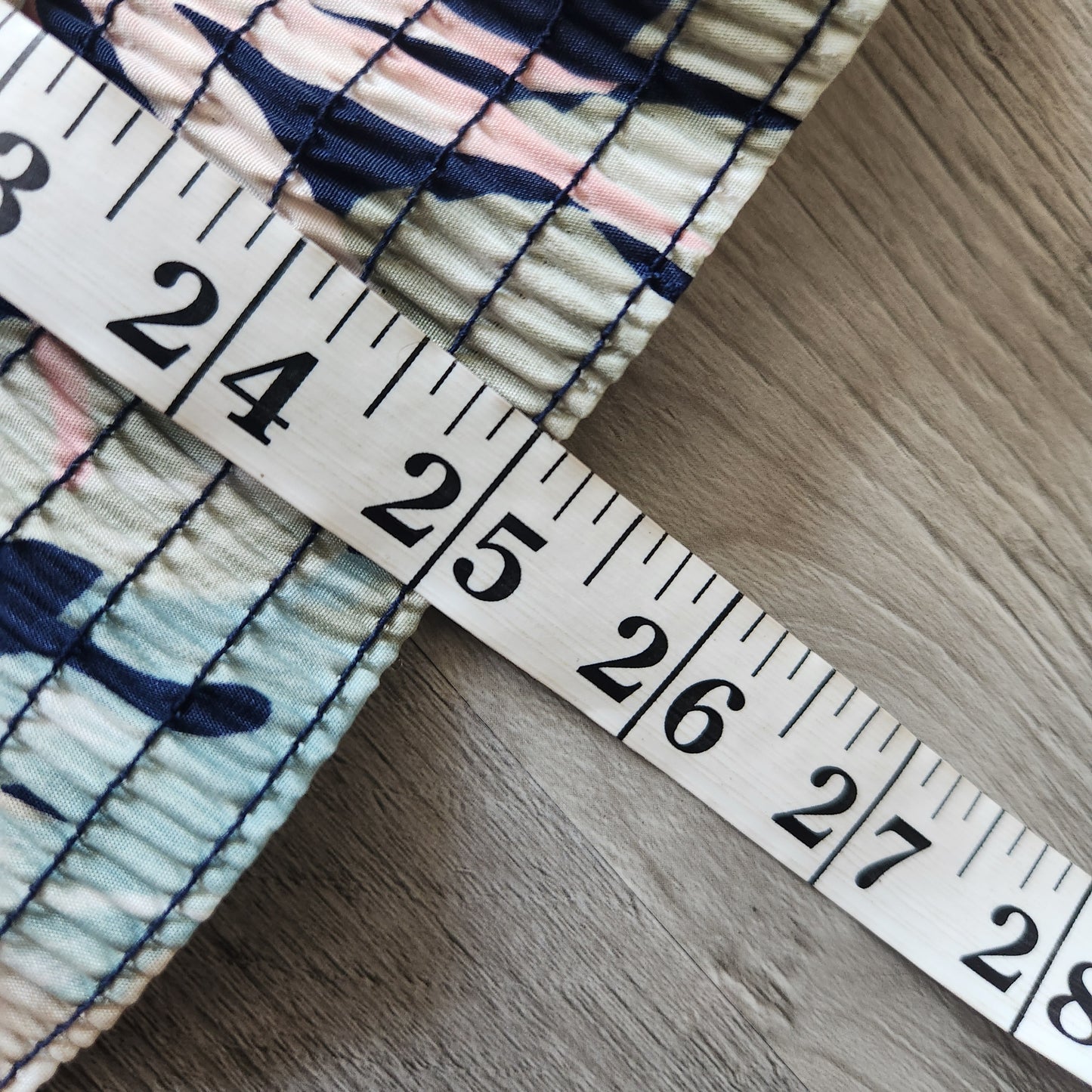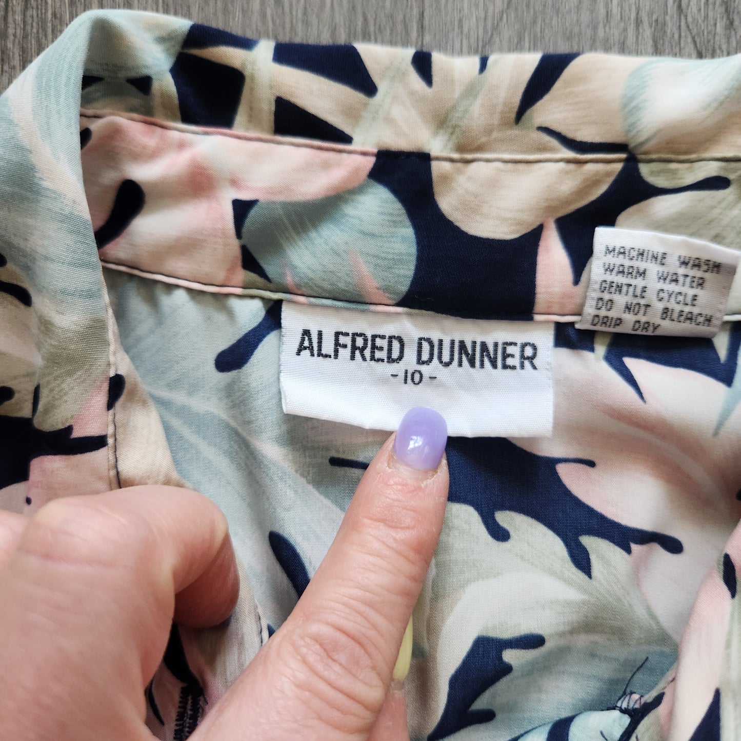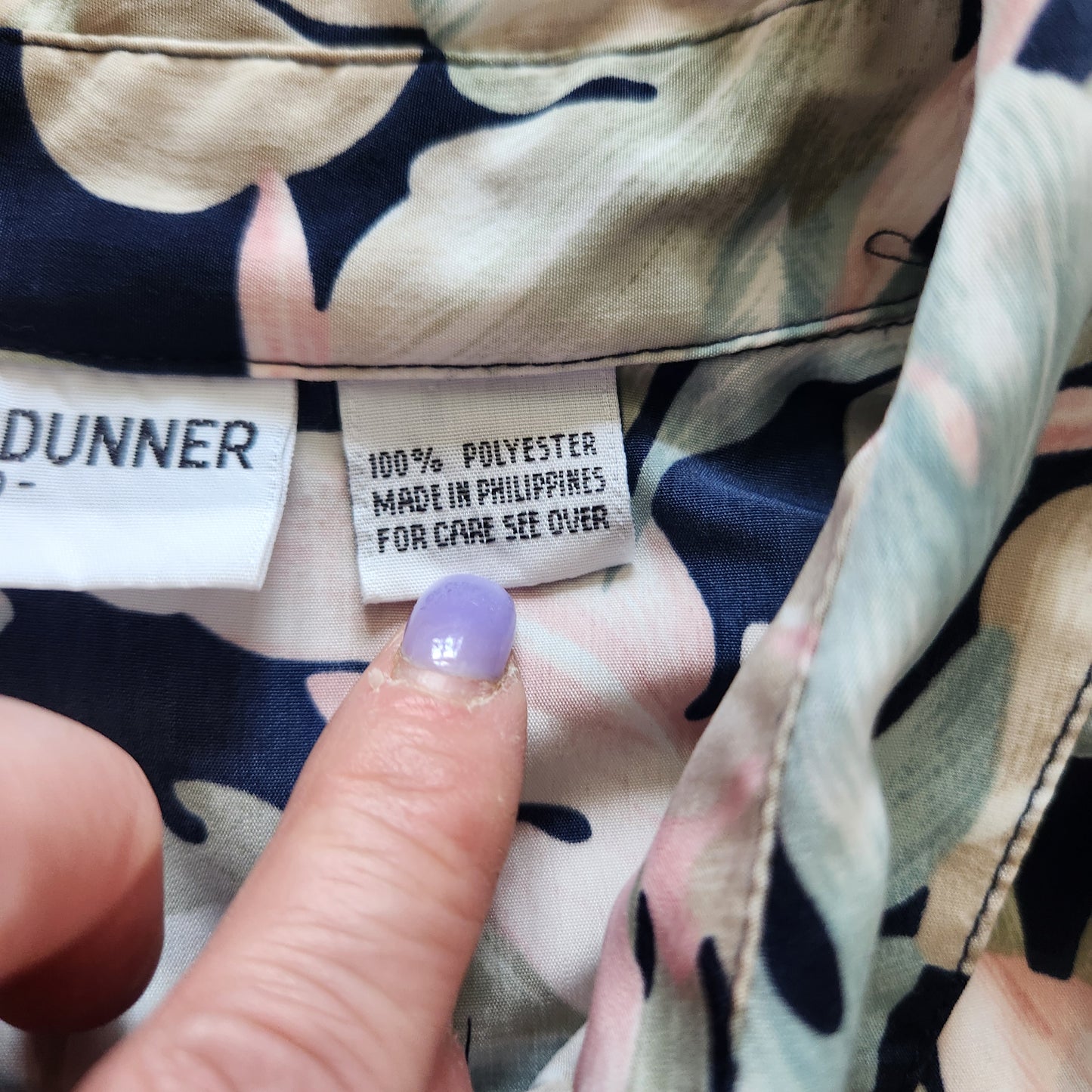 Short Sleeve, collared top with stretchy, smocked bottom hem and half button down front. Women's size 10
