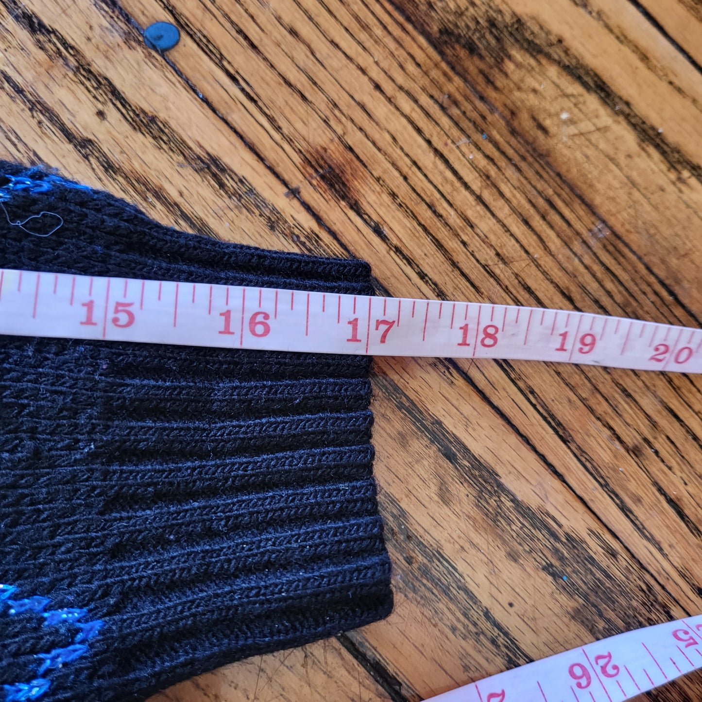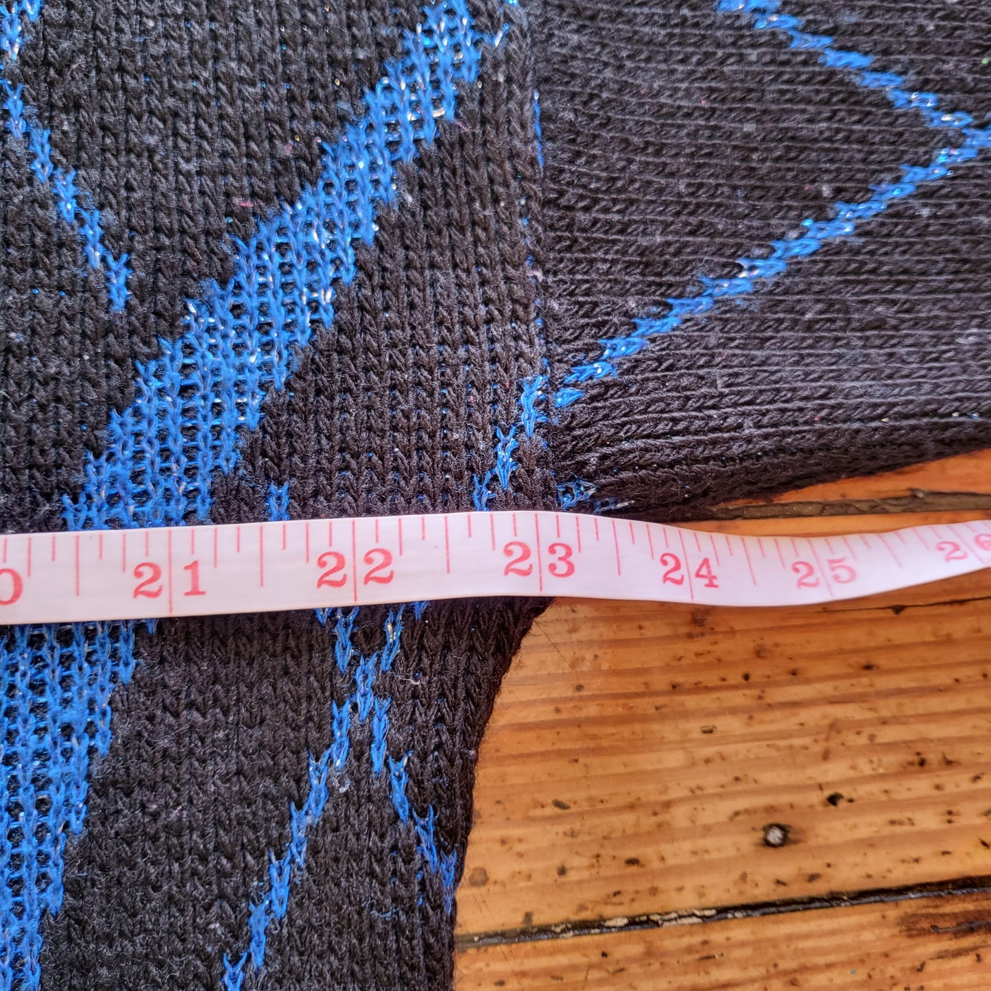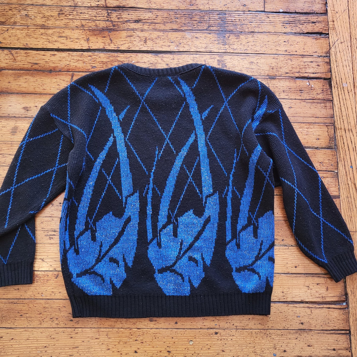 Black knit Crewneck, long sleeve sweater with blue metallic leaf pattern