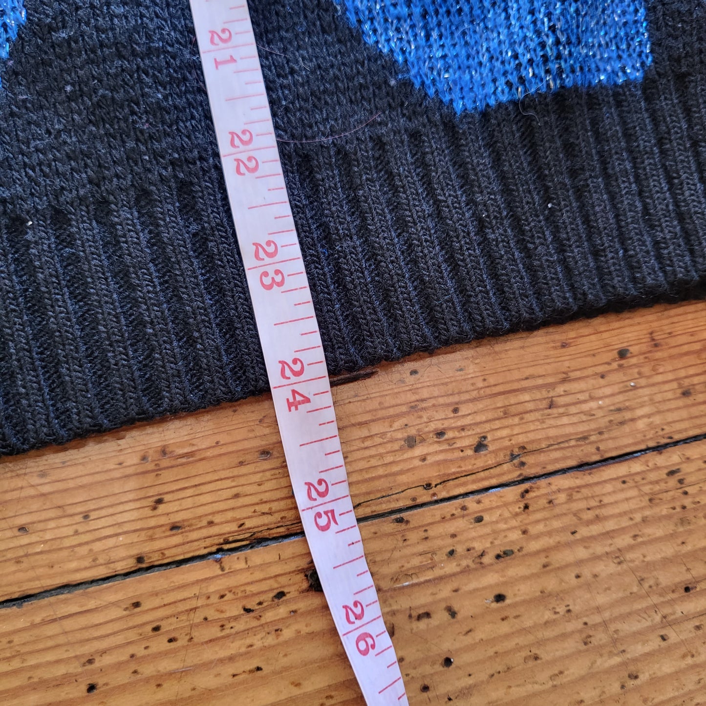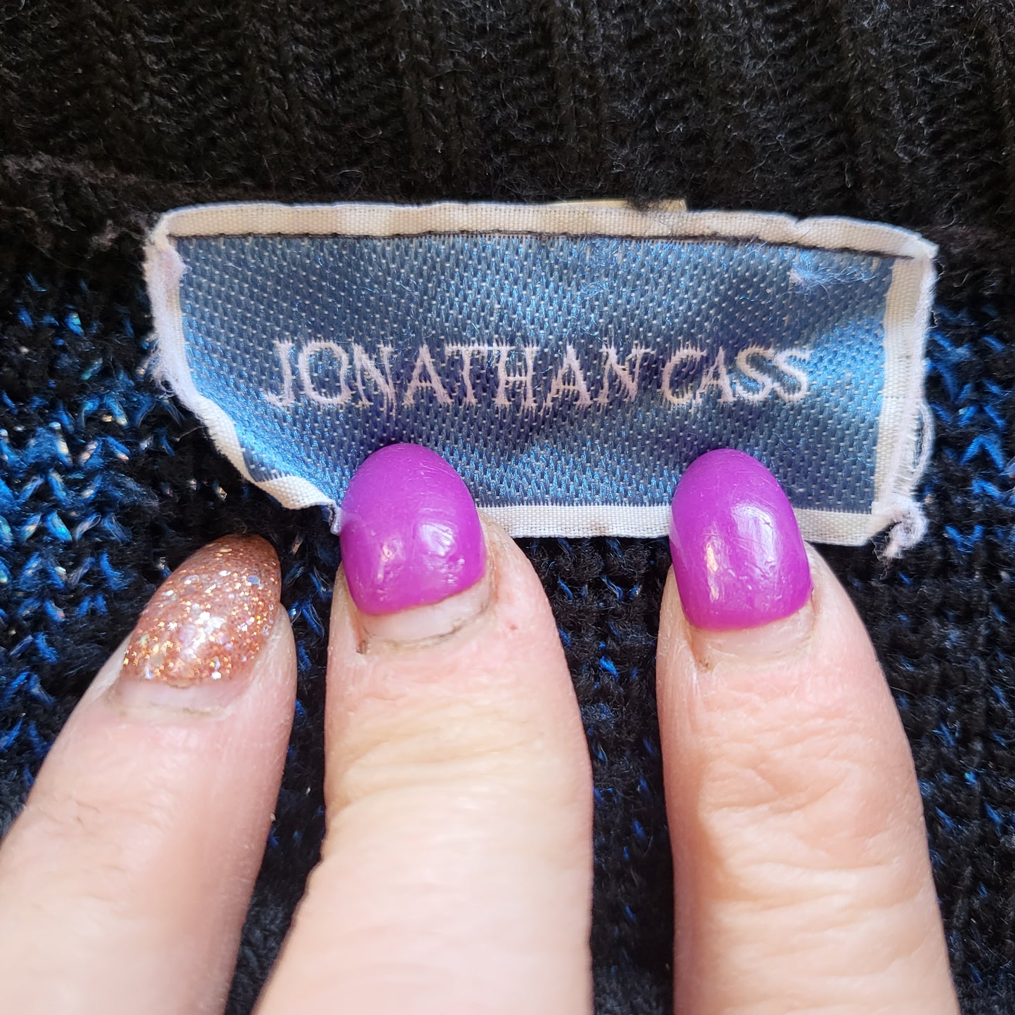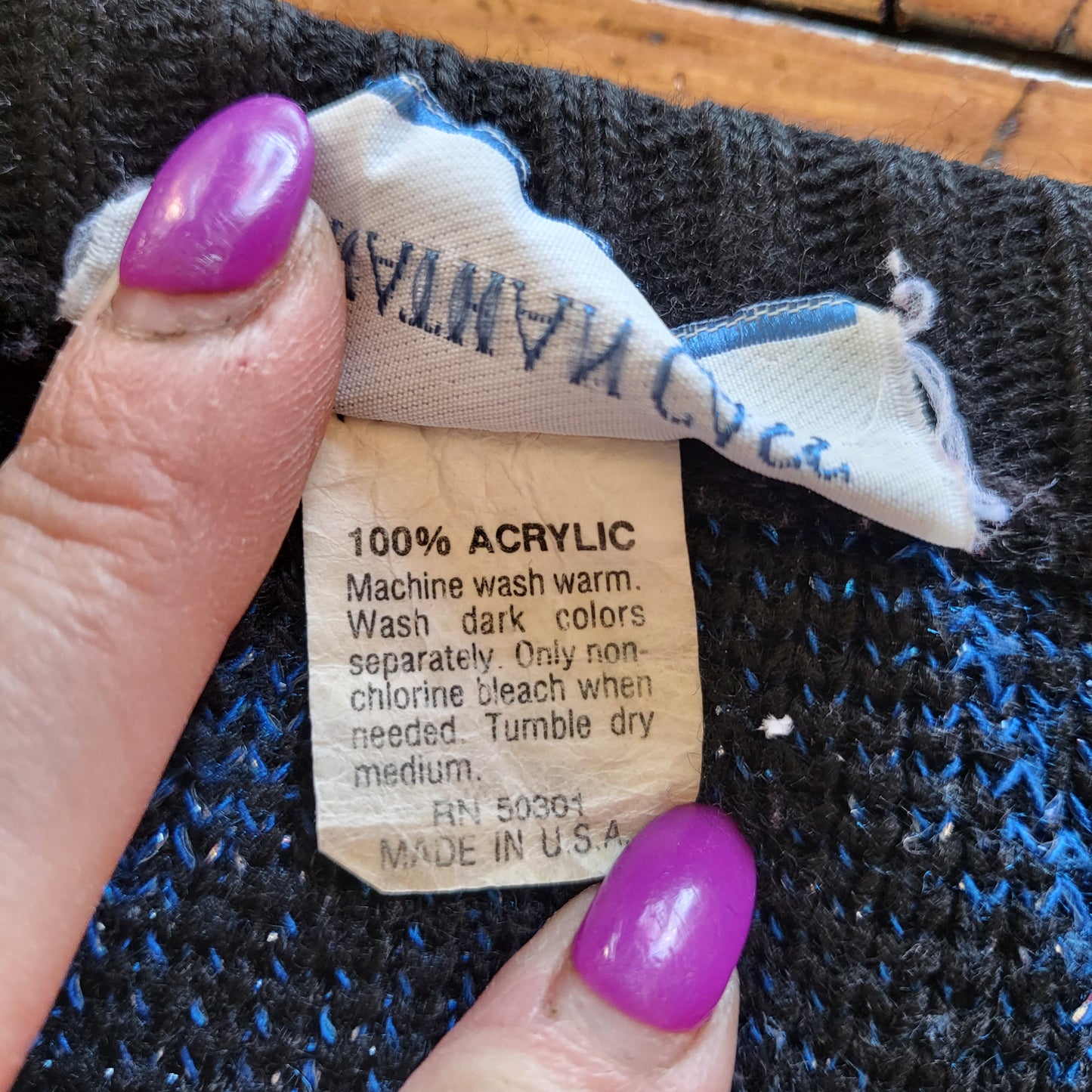 Black knit Crewneck, long sleeve sweater with blue metallic leaf pattern