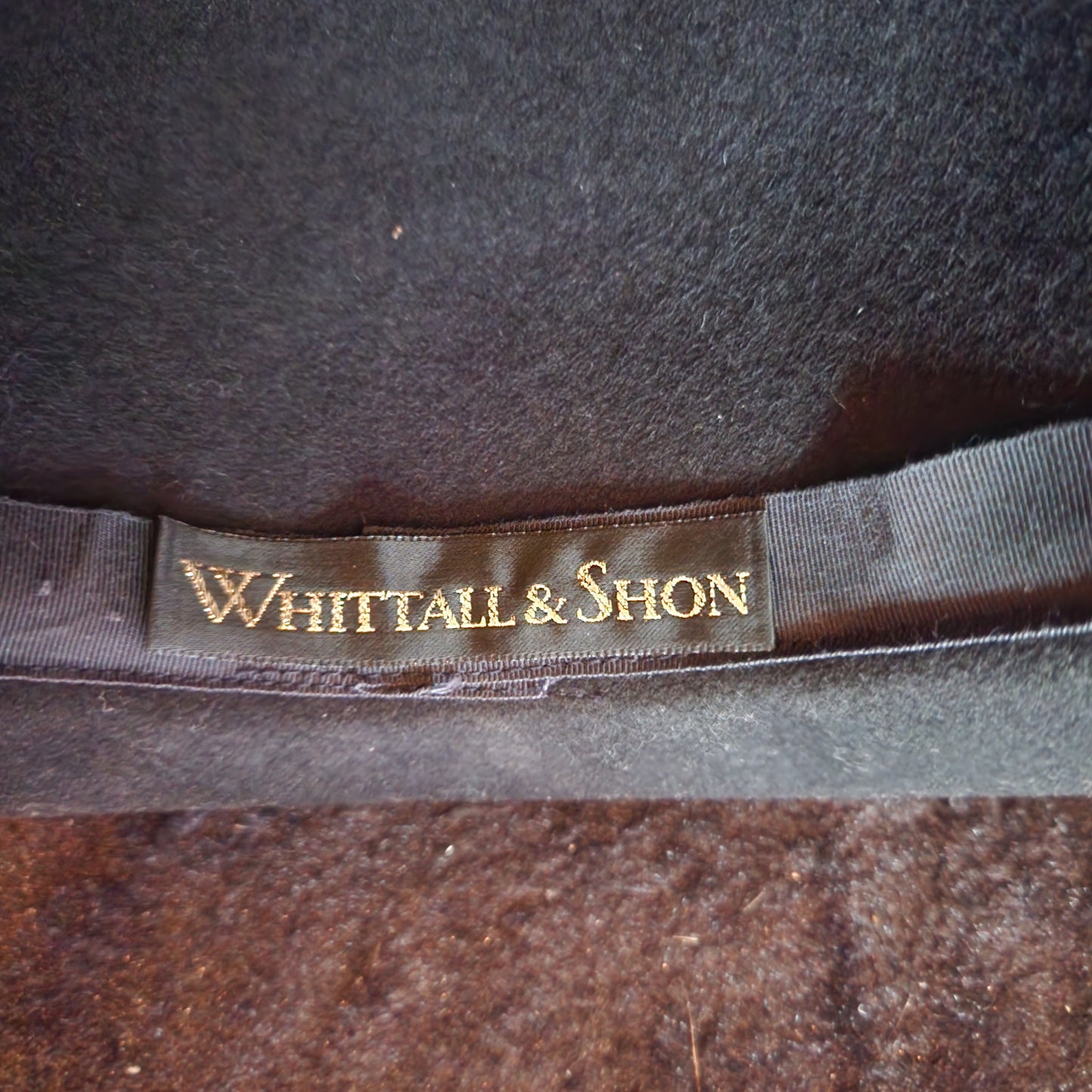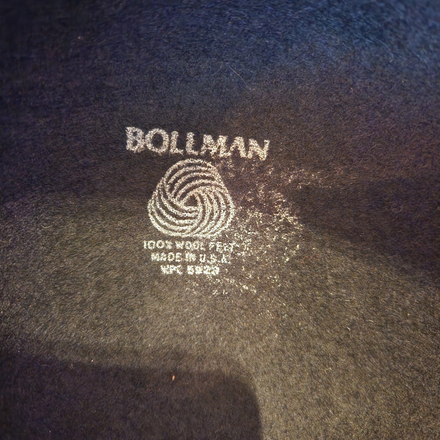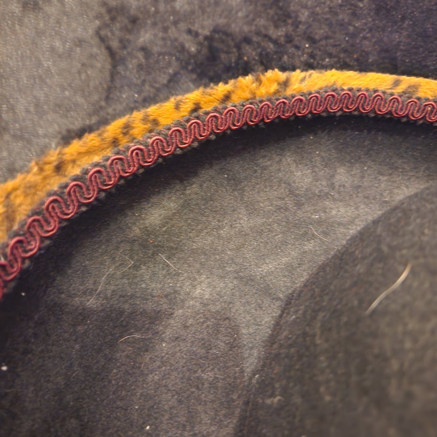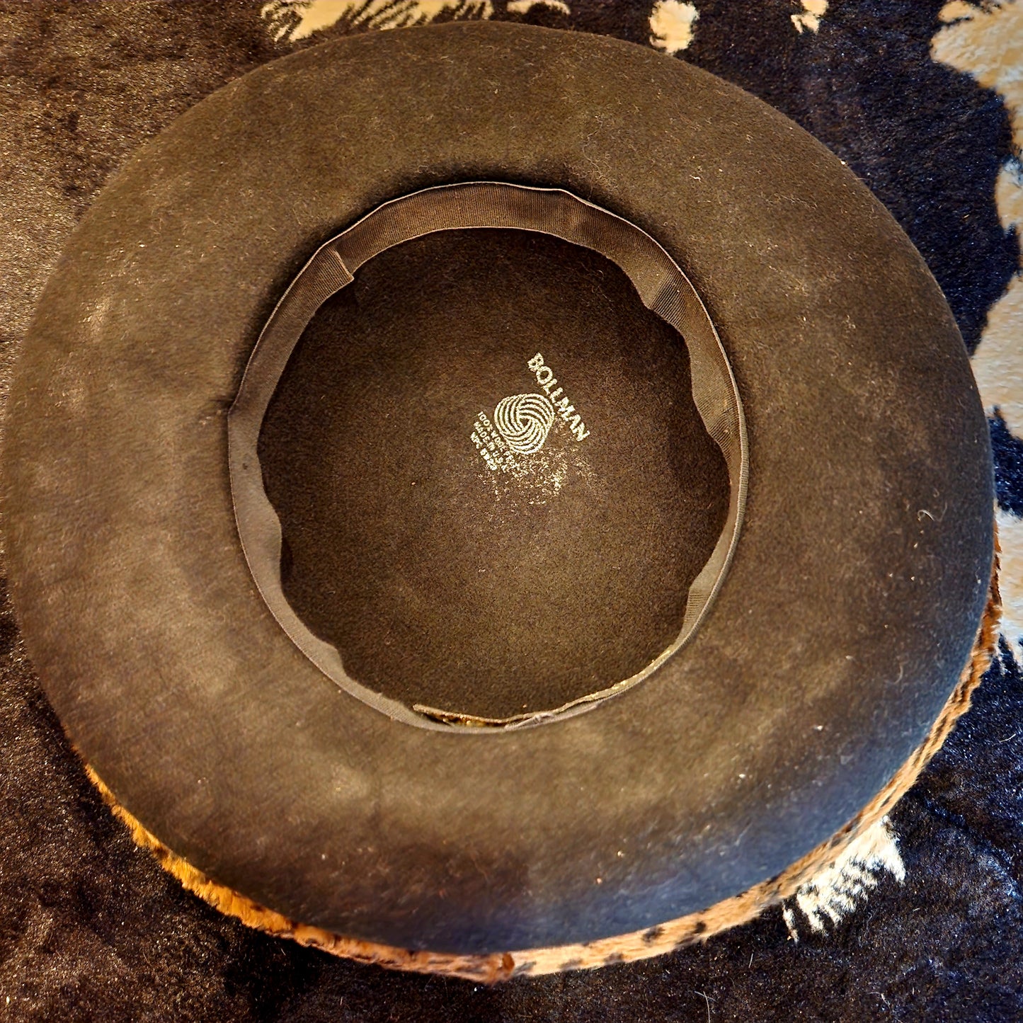 Black felt derby hat. Furry animal print trim around brim. Made in USA