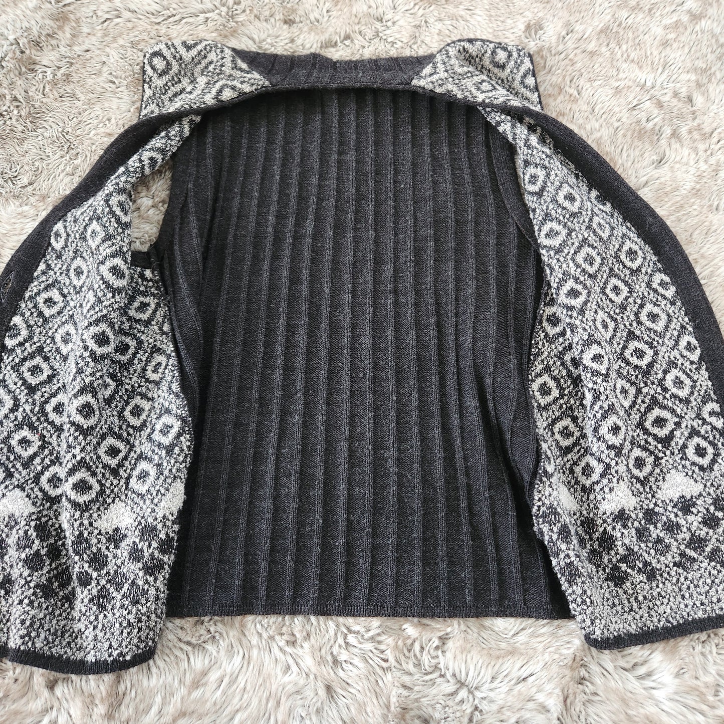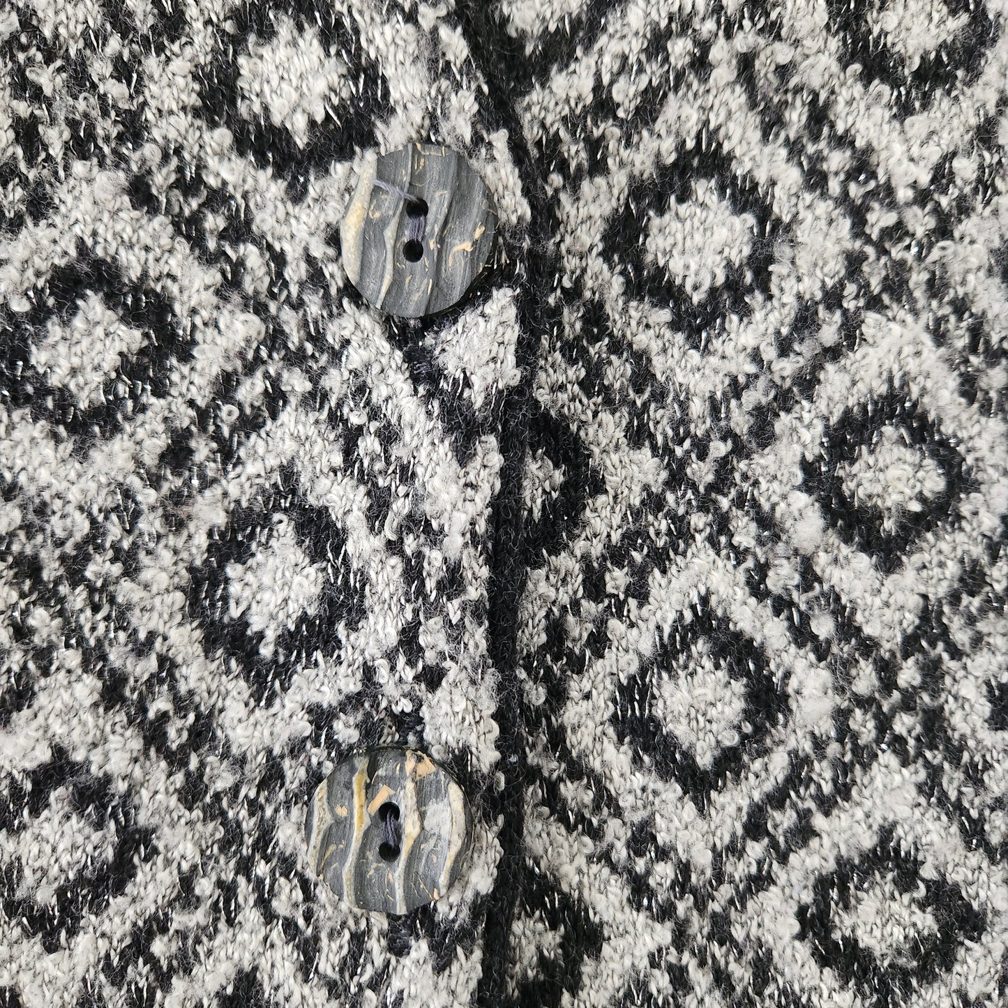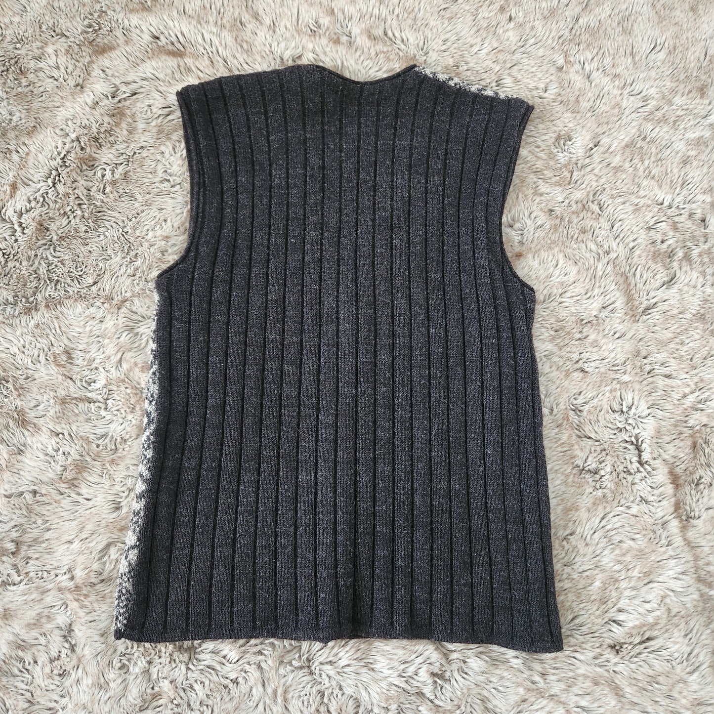 Knit v-neck sweater vest with front button closure. Textured, unique buttons